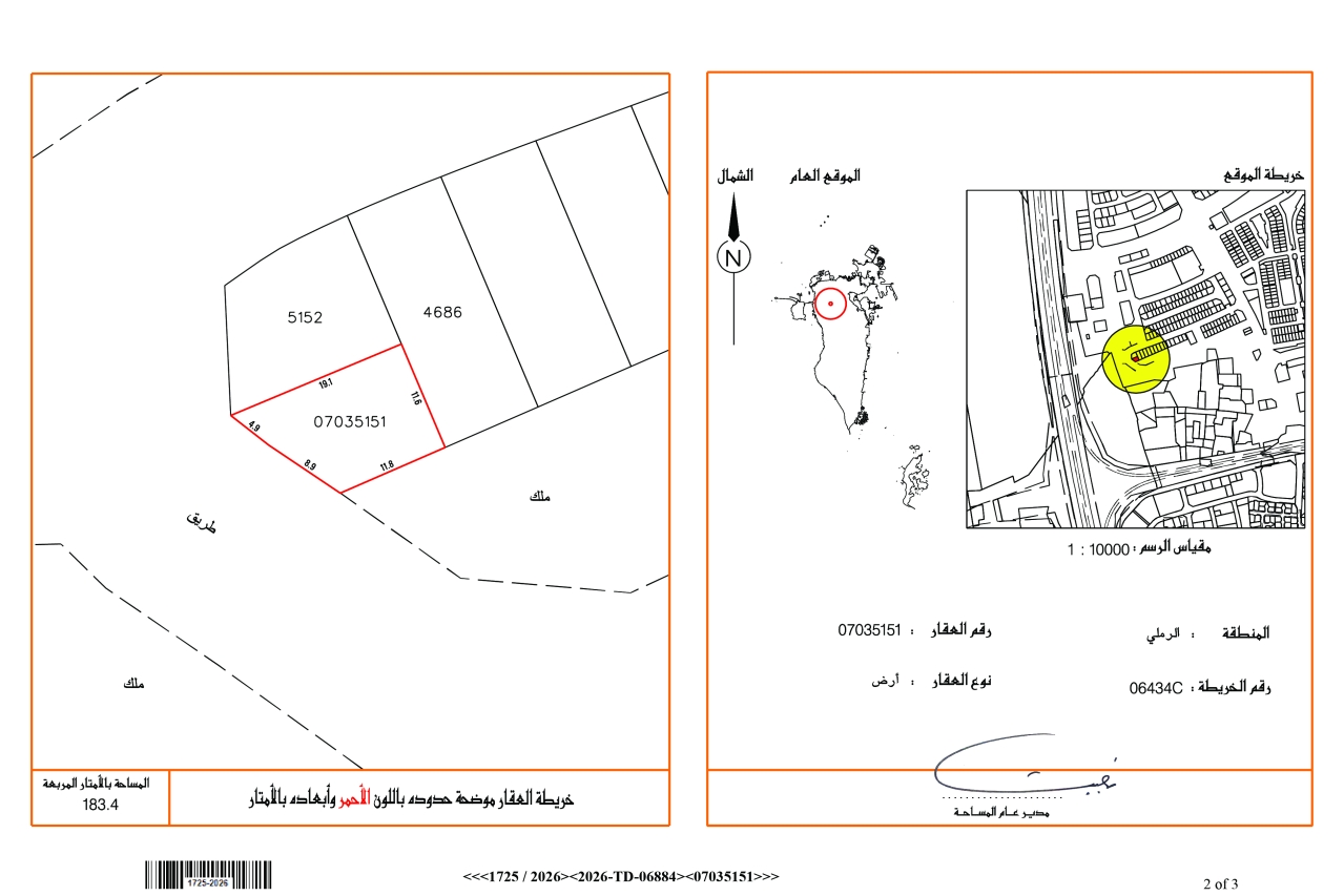 أرض سكنية للبيع في الرملي بتصنيف RHA (سكن متصل - أ). مساحة أرض 183.4 متر مربع, بسعر 30.50د.ب لكل قدم مربع , السعر الإجمالي 61,197.720د.ب