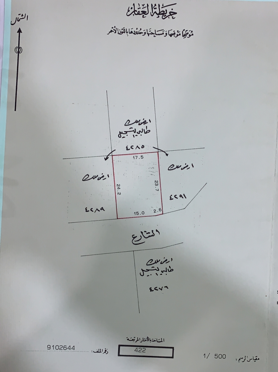 أرض سكنية للبيع في باربار بتصنيف RB (سكن خاص - ب). مساحة أرض 422 متر مربع, بسعر 26.50د.ب لكل قدم مربع , السعر الإجمالي 120,300.000د.ب