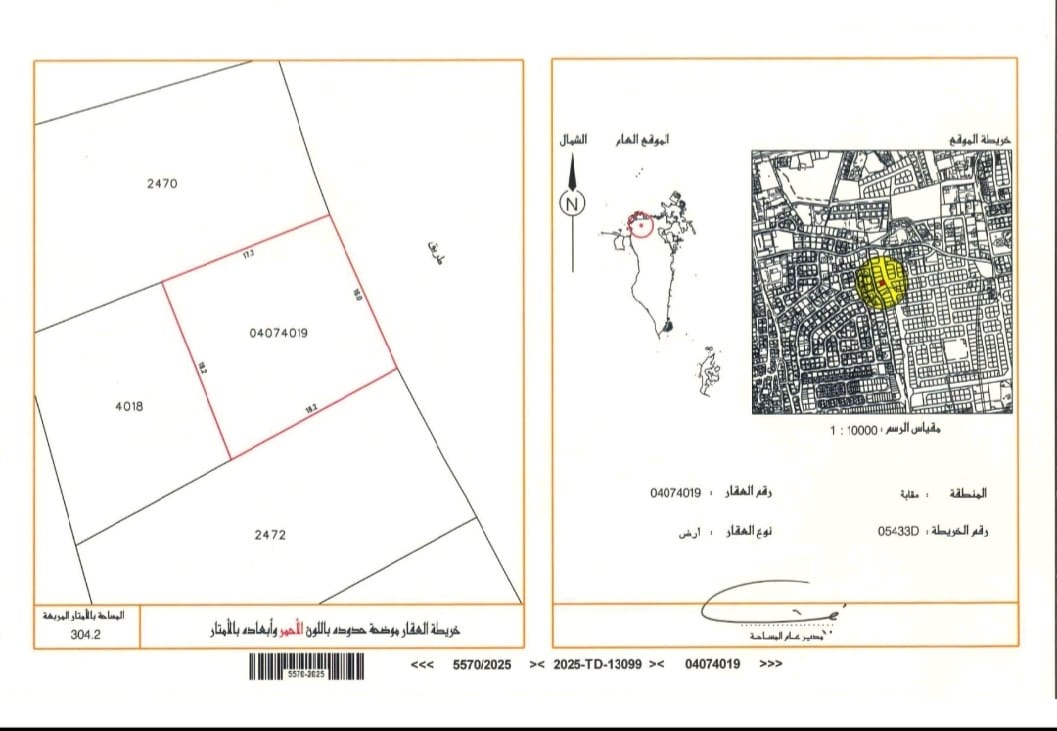 أرض سكنية للبيع في مقابة بتصنيف RA (سكن خاص - أ). مساحة أرض 304.2 متر مربع, بسعر 29.00د.ب لكل قدم مربع , السعر الإجمالي 94,957.890د.ب
