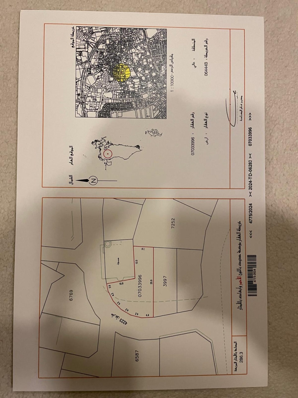 Residential Land for Sale in A'ali with a classification of RHA (Connected Residential Area – A). The Land size is 286.3 SQM, priced at 30.00BHD per SQFT , with a total price of 92,451.900BHD
