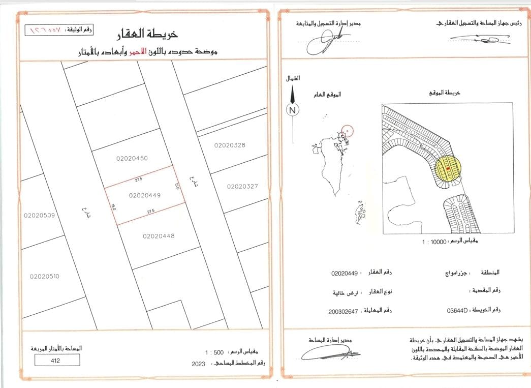 Residential Land for Sale in Amwaj Island with a classification of SP (Special Project ) located on Two Roads (Front & Back). The Land size is 412 SQM, priced at 29.00BHD per SQFT , with a total price of 128,608.330BHD