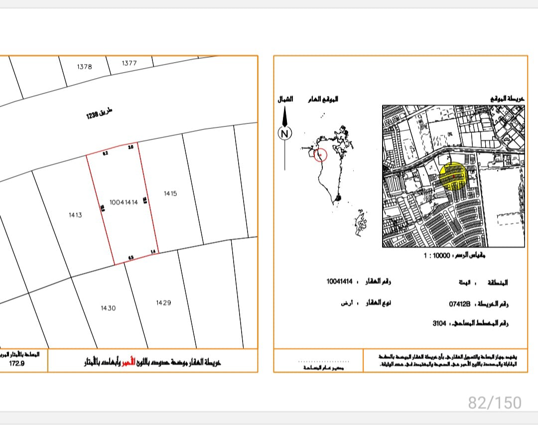 Residential Land for Sale in Hamalah with a classification of RHA (Connected Residential Area – A) located on One Road. The Land size is 172.9 SQM, priced at 27.00BHD per SQFT , with a total price of 50,249.700BHD