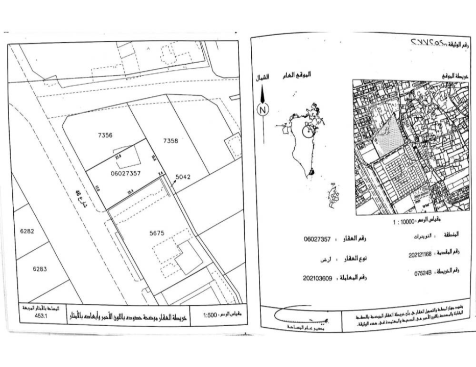 Residential Land for Sale in Hawrat Sanad with a classification of RB (Private Residential Area - B) located on One Road. The Land size is 453.1 SQM, priced at 27.00BHD per SQFT , with a total price of 131,683.590BHD